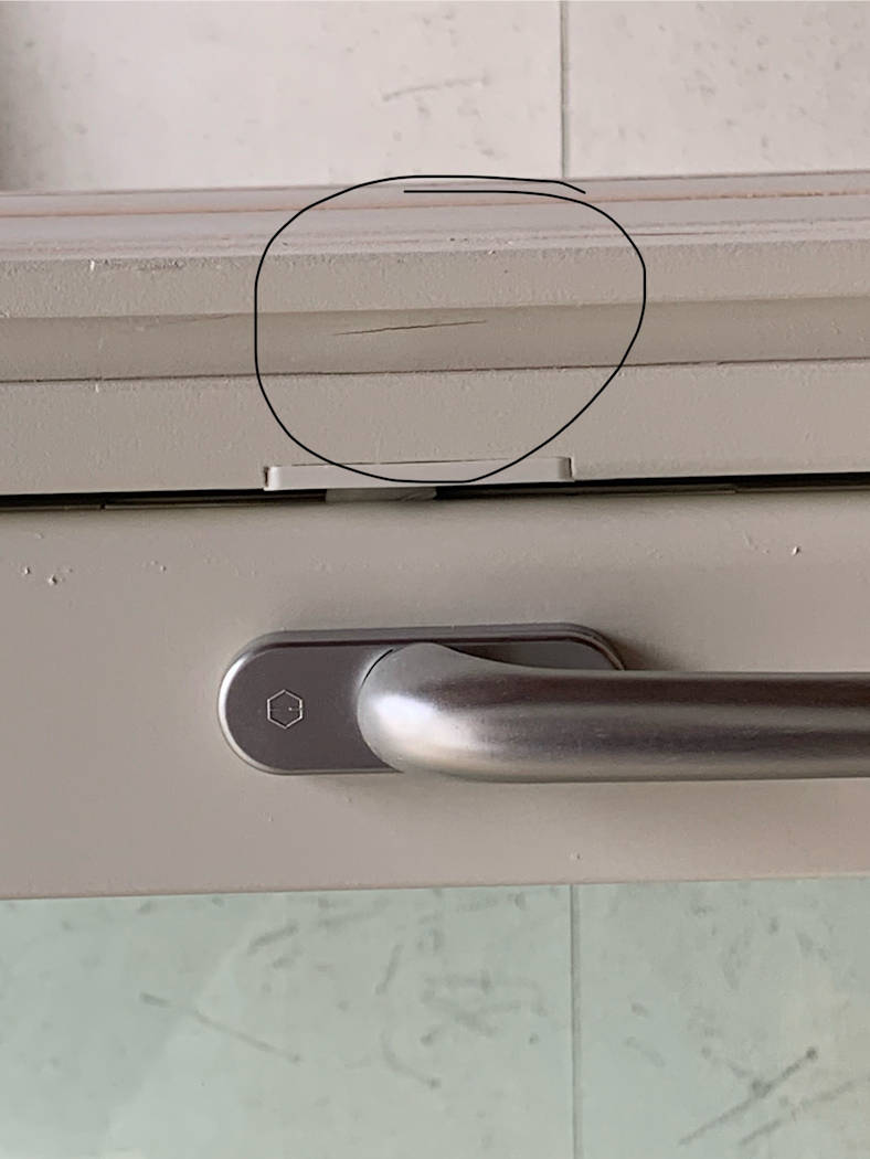 Naturlig sprekk i treverk inne i notspor på vindu Trykkskade på ytterkant karm som blir skjult ved listing